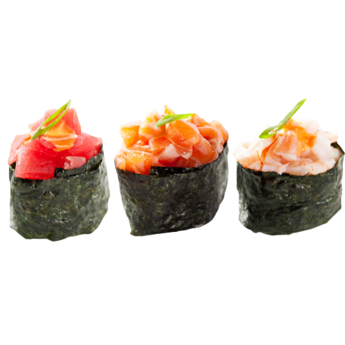 Gunkan di Sake, Maguro, Ebi (salmone, tonno pinne gialle, gambero cotto)