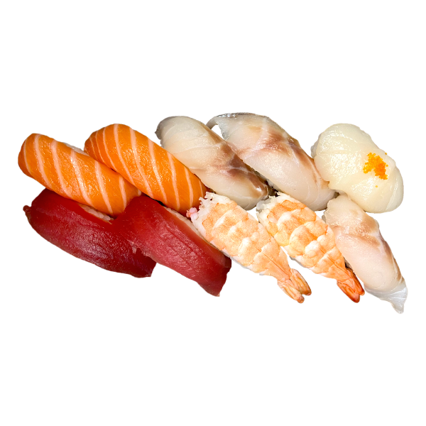 2 tonno, 2 salmone, 2 branzino, 2 gambero cotto, 1 sake flambè e 1 maguro flambè