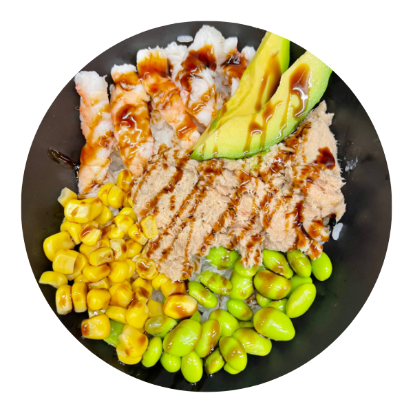 Base di riso bianco sushi, gamberi cotti al vapore, edamame, salsa di tonno pinna gialla, avocado, mais e salsa Teriyaki