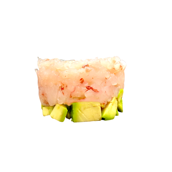 Tartare di gambero rosso del mar Mediterraneo marinato con sale, pepe, olio extravergine di oliva, lime e avocado