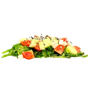 Insalata di alghe wakame, pomodorini ciliegino, cetriolo, tofu e sesamo