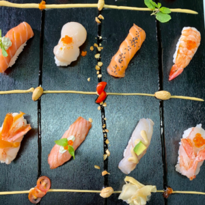 Selezione dei 16 migliori tagli di nigiri guarniti a fantasia dallo chef con perle di soia, yuzu, riduzione di salsa Banshi e salsa teriyaki