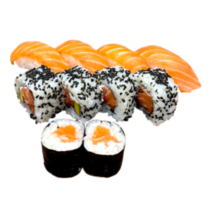 Misto di 17 pezzi con 2 nigiri sake, 2 nigiri maguro, 3 hosomaki sake, 4 uramaki philadelphia, 3 sashimi sake, 3 sashimi maguro